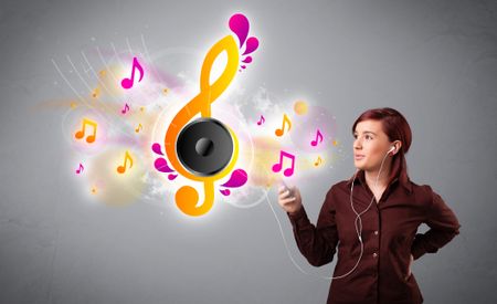 pretty girl singing and listening to music with musical notes getting out of her mouth