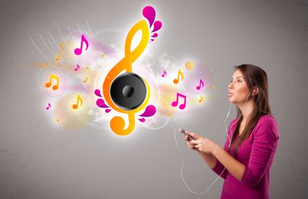 pretty girl singing and listening to music with musical notes getting out of her mouth