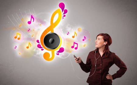pretty girl singing and listening to music with musical notes getting out of her mouth