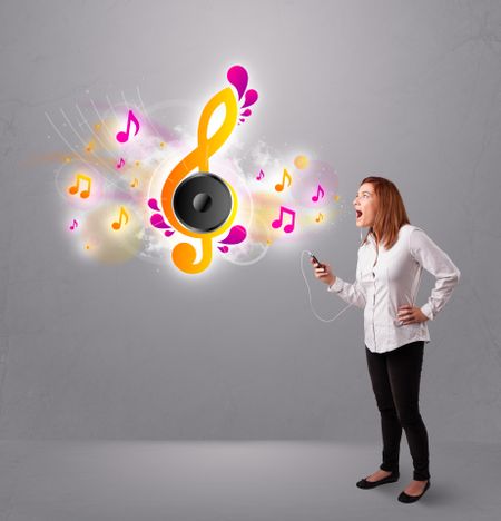 pretty girl singing and listening to music with musical notes getting out of her mouth