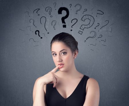A pretty teenage girl standing confused in front of grey wall background with drawn question marks concept.