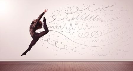 Pretty woman jumping with hand drawn lines and arrows come out concept