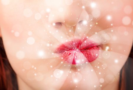 Pretty woman lips blowing abstract white lights - close up