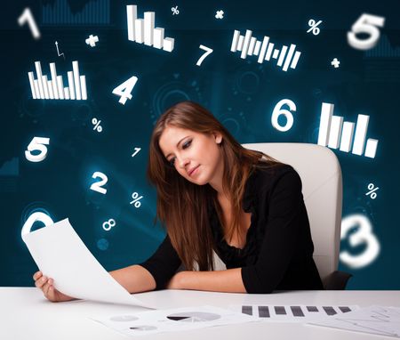 Pretty young businesswoman sitting at desk with diagrams and statistics