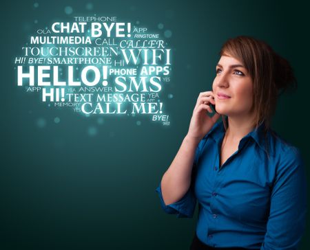 Pretty young girl calling by phone with word cloud