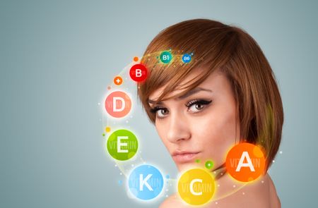 Pretty young girl with colorful vitamin icons and symbols on gradient background