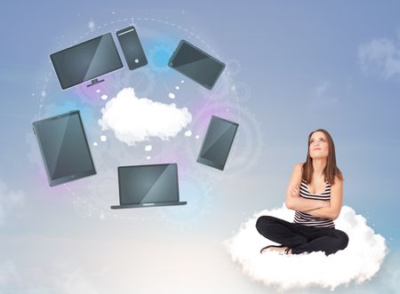 Pretty young girl sitting on cloud enjoying cloud network service