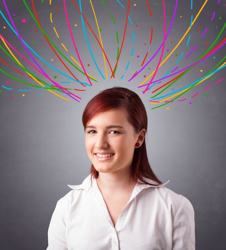 Pretty young girl thinking with colorful abstract lines overhead