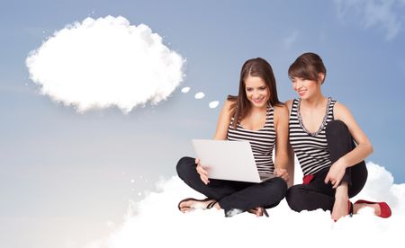 Pretty young girls sitting on cloud and thinking of abstract speech bubble with copy space