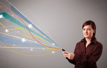 pretty young lady standing and holding a phone with colorful abstract lines and arrows