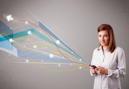 pretty young lady standing and holding a phone with colorful abstract lines and arrows