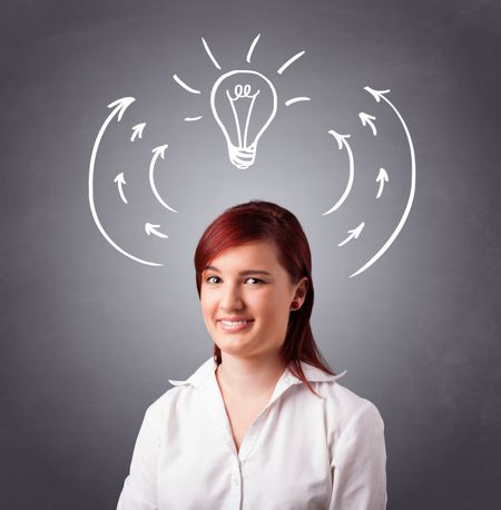 Pretty young lady standing and thinking with arrows and light bulb overhead
