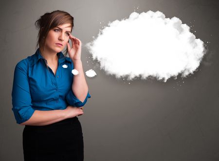 Pretty young lady thinking about cloud speech or thought bubble with copy space