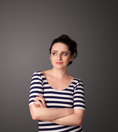 Pretty young woman gesturing with empty space