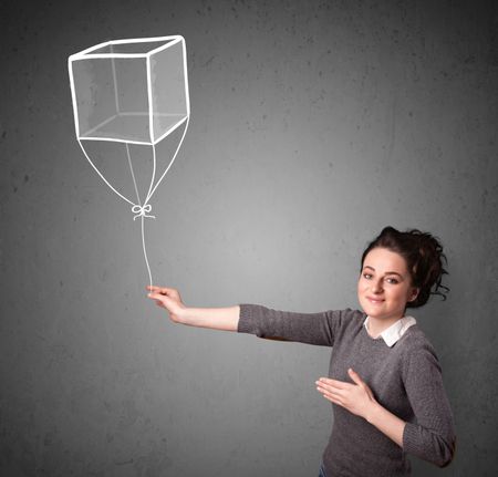 Pretty young woman holding a drawn cube balloon