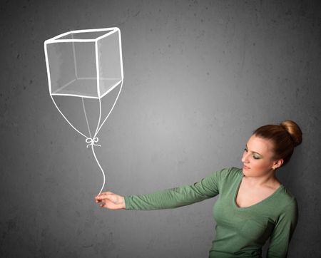 Pretty young woman holding a drawn cube balloon
