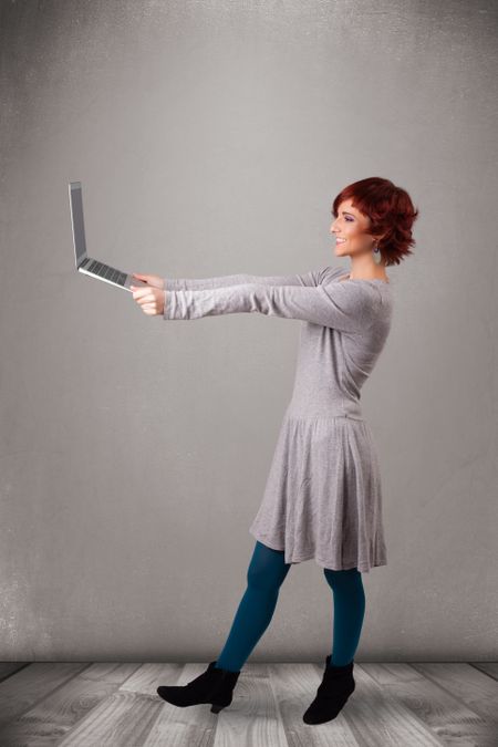 Pretty young woman holding modern laptot
