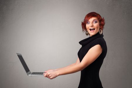 Pretty young woman holding modern laptot
