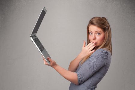 Pretty young woman holding modern laptot