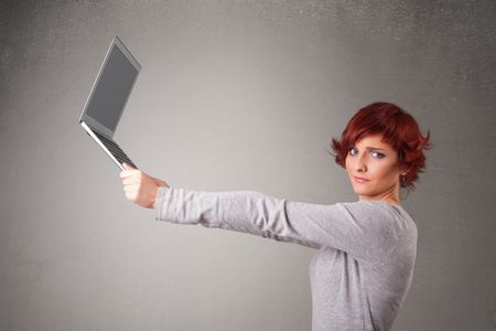 Pretty young woman holding modern laptot