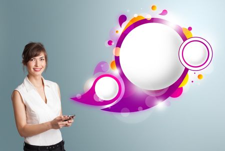 Pretty young woman holding a phone and presenting abstract speech bubble copy space