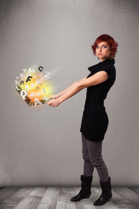 Pretty young woman hoolding notebook with colorful abstract letters