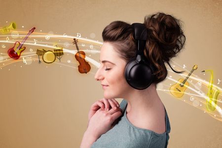 Pretty young woman listening to music, instruments concept
