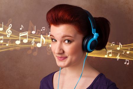 Pretty young woman listening to music, notes concept