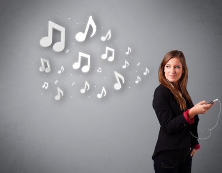 Pretty young woman singing and listening to music with musical notes getting out of her mouth