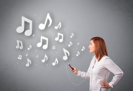 Pretty young woman singing and listening to music with musical notes getting out of her mouth