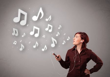 Pretty young woman singing and listening to music with musical notes getting out of her mouth
