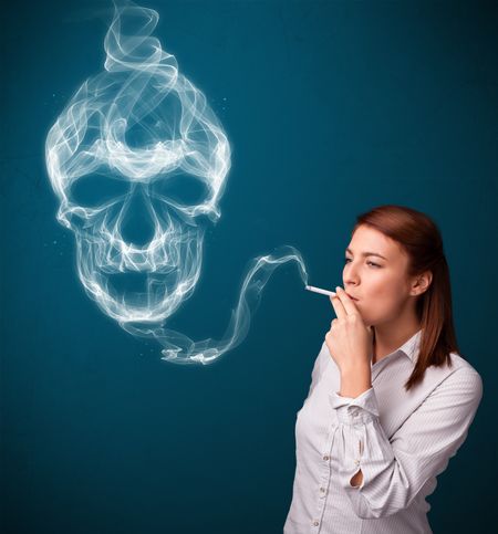Pretty young woman smoking dangerous cigarette with toxic skull smoke