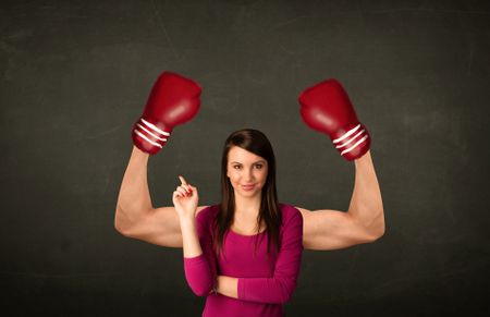 Pretty young woman with strong and muscled boxer arms concept