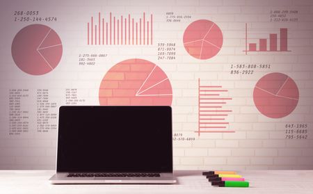 A professional laptop with blank screen sitting on a white office desk in front of wall full of pie charts and graphs concept