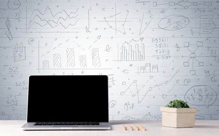 A professional laptop with blank screen sitting on a white office desk in front of wall full of pie charts, calculations and graphs concept