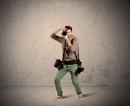 A professional male photographer with belt holding a camera and taking photos in front of clear grey urban wall background concept
