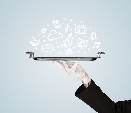 A professional waiter holding a silver plate with drawn communication, business and online media icons in front of a light blue background