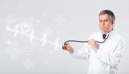 Proffesional doctor examinates heartbeat with abstract heart