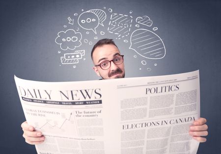 Puzzled young businessman reading daily newspaper with speech bubbles above his head