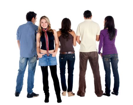 Rear view of a casual group of people with a girl facing the camera - isolated