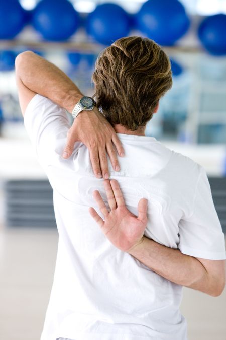 rear view of a gym man stretching arms and back at the gym