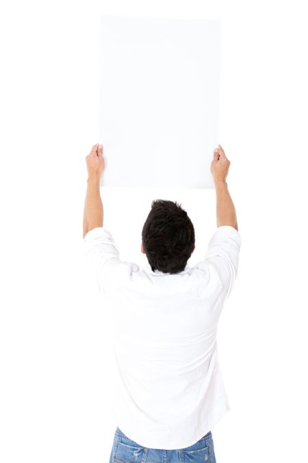 Rear view of man holding at a banner - isolated over a white background