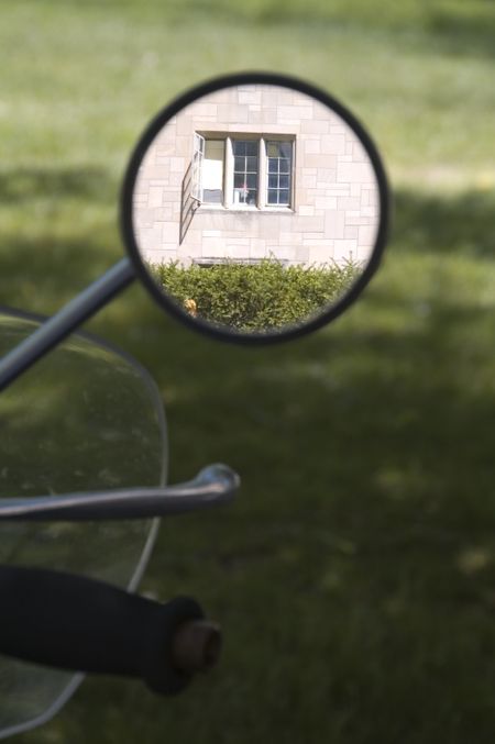Rearview mirror on motorcycle in shade reflects window of university building in sunlight