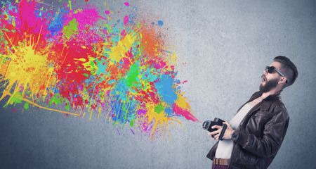 A retro hipster male taking photograph with a vintage camera of an urban wall with paint splatter concept
