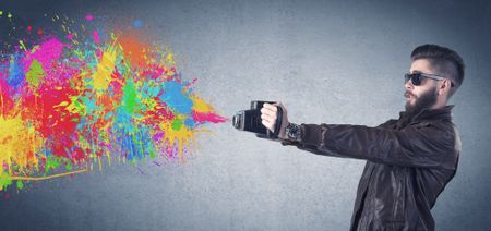 A retro hipster male taking photograph with a vintage camera of an urban wall with paint splatter concept