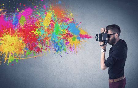 A retro hipster male taking photograph with a vintage camera of an urban wall with paint splatter concept