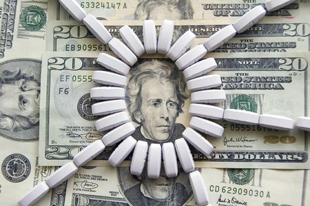Ring of light-colored tablets on U.S. $20 bills