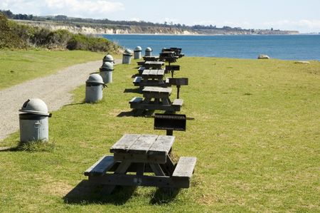 Row of picnic tables, grills, and garbage cans in public park along coastline