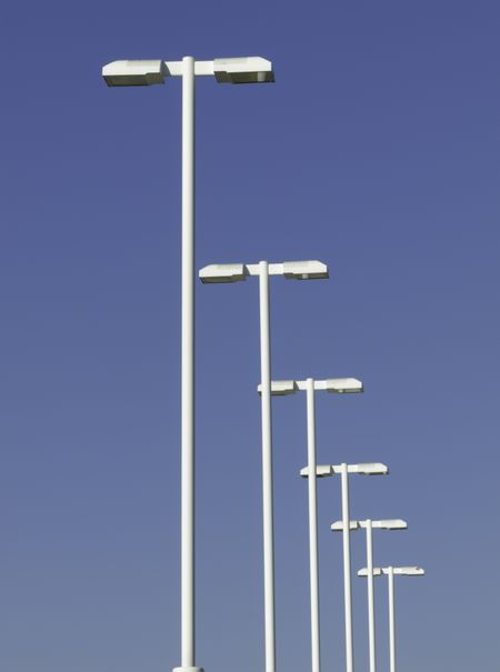 Row of tall white lampposts over parking lot, with background of blue sky