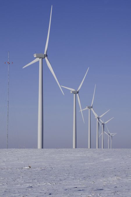Row of wind turbines, part of windfarm in rural Illinois, in winter